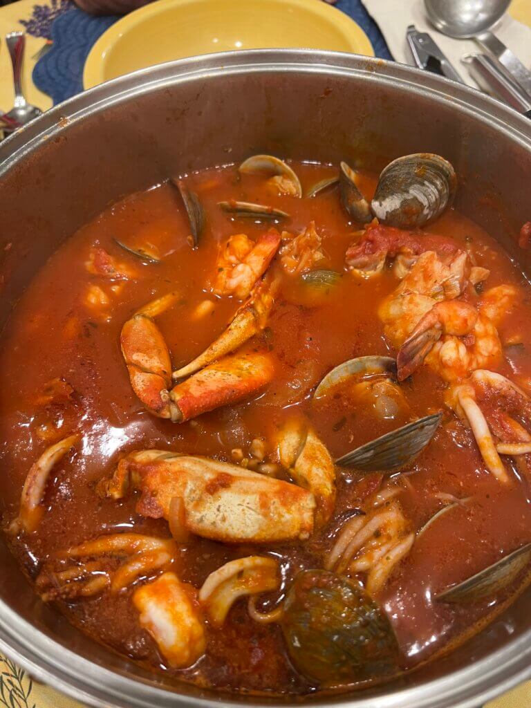 Christmas Eve tradition – Cioppino, the most efficient way to cover the Feast of the Seven Fishes in an Italian-American-Californian home. I inherited the Christmas Eve family dinner a few years back to offload the full annual holiday meals burden from my mom. I think it’s a pretty good deal because honestly, unlike other holiday meals in our family, Cioppino takes center stage and you really can’t put too much else on the menu (assuming of course that all the guests enjoy seafood).