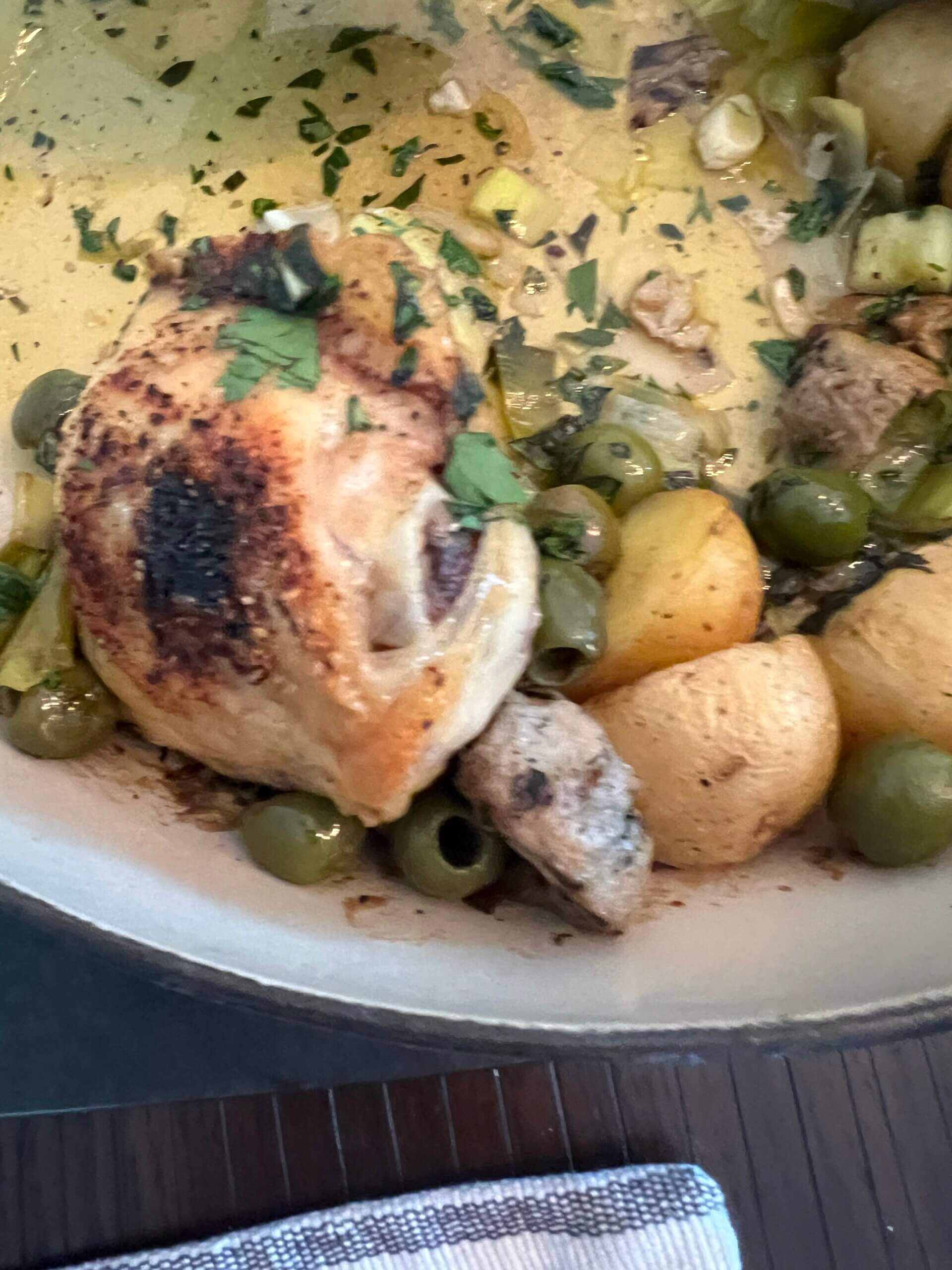 Cut the potatoes in half or quarters. Place the leeks, garlic, and potatoes into a shallow braising pan, glass pan or roasting pan. Drizzle with olive oil and season with salt and pepper. The vegetables and chicken can be somewhat crowded, not too spread out in the pan so they don’t dry out.